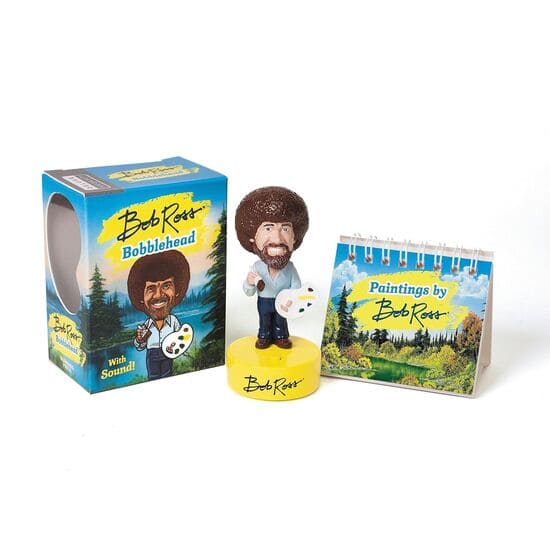 A charming 4‑inch bobblehead of Bob Ross that vocalizes 10 of his famous sayings, accompanied by a mini easel-style book showcasing 30 of his landscapes.
